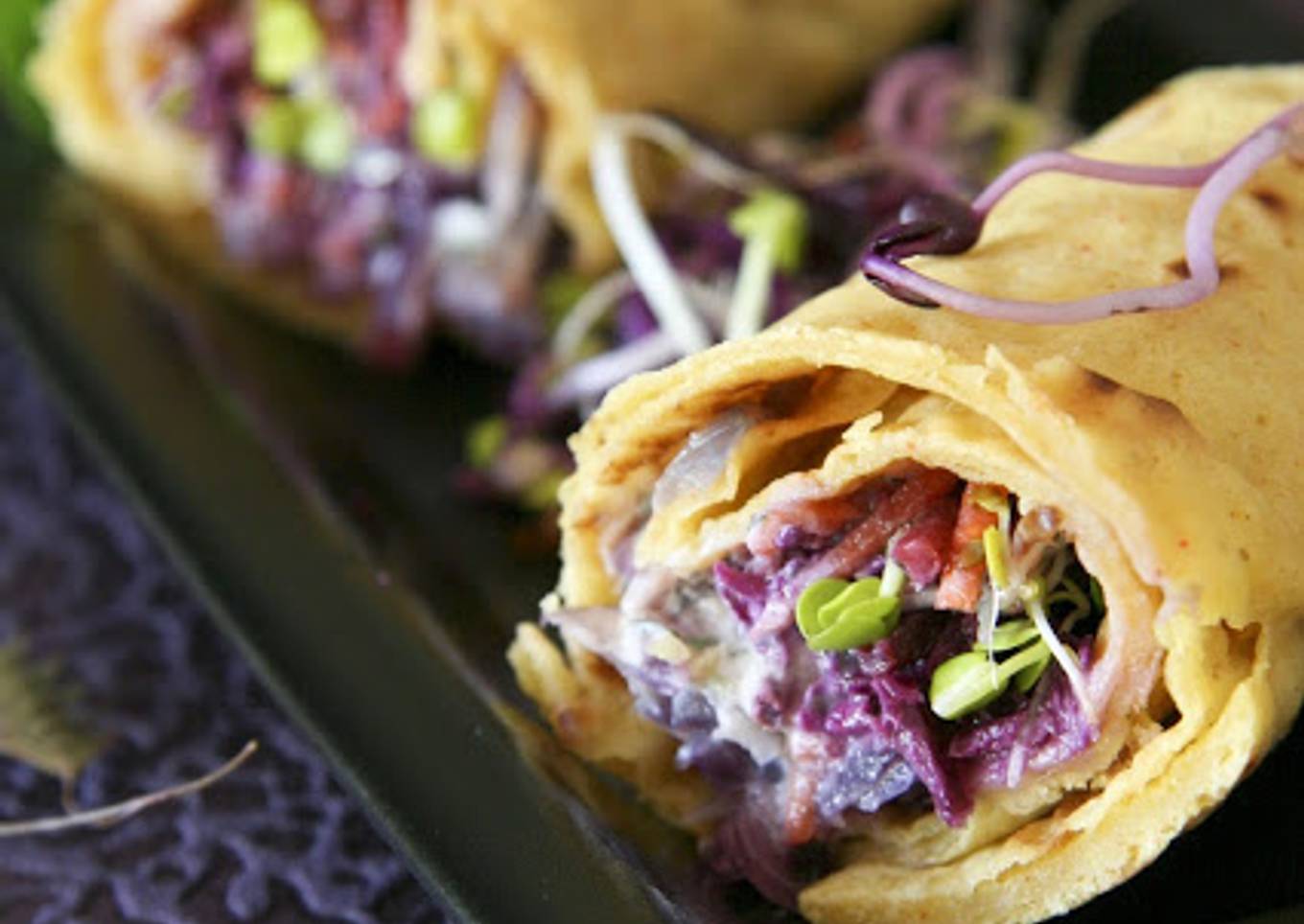Recommencez jusqu'à ce qu'il n'y ait plus de pâte. - J'ai garni mes crêpes, d'oignons rouges revenus à la poêle dans de l'huile de coco, de carottes râpées pourpres, de jeunes pousses de radis et d'une sauce façon raïta au concombre.