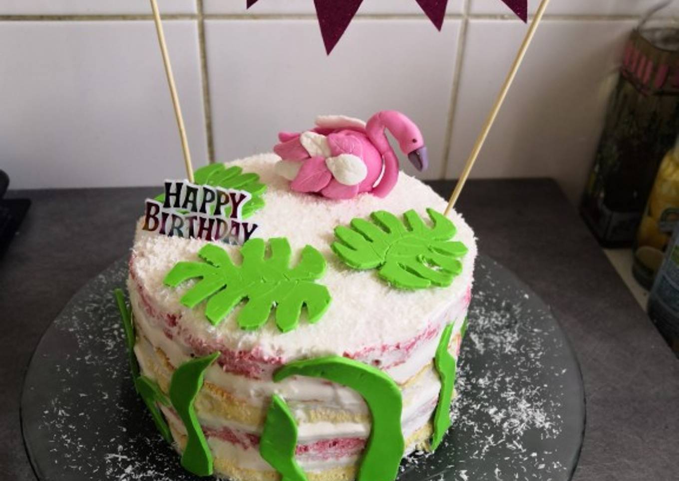 - Enfin, décorez avec la pâte à sucre. J'ai fabriqué un flamant rose et des feuilles un peu tropicales. Vous trouverez d'autres de mes recettes sur mon blog: https://mapetitecuisinefamiliale.wordpress.com ainsi que sur ma page facebook :Ma Petite Cuisine Familiale.