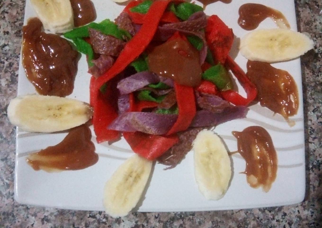 - Découpez avec les crêpes en ruban, mélangez dans un plat. Ajoutez la banane et la sauce caramel.