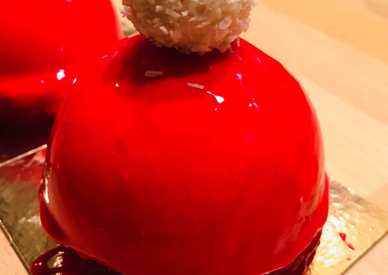 - Versez votre crème, mettez votre insert à la fraise, le praliné votre dacquoise et remettez la mousse à la vanille. Placez vos demi-sphères au congélateur jusqu’au jour j.